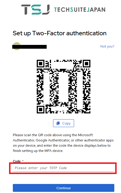 認証アプリで表示されている一時的なPINコードを入力し、「Continue」をクリックしてログインできます。