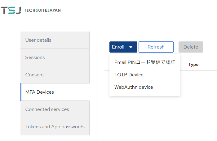 MFA Device→Enrollから、パスワードの代わりに、いくつのMFA(2段階認証)ログイン方法が設定できます。