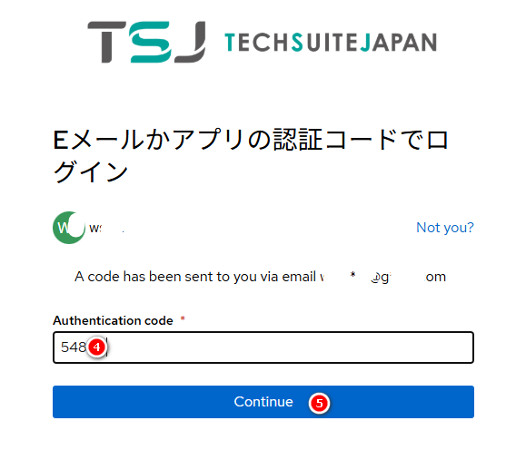 表示された下記画面へ登録申請したメールアドレスを入力し、[Continue]をクリックしてください。